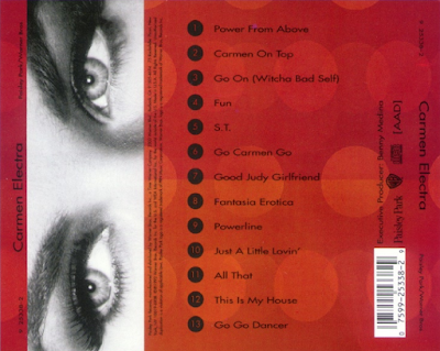 Carmen Electra (15 June 1992) 1. Power From Above (4:35) 2. Carmen On Top (3:42) 3. Go On (Witcha Bad Self) (4:08) (Levi Seacer Jr./Carmen Electra) 4. Fun (3:42) 5. S.T. (4:03) (The Ohio Players) 6. Go Carmen Go (4:33) 7. Good Judy Girlfriend (1:59) 8. Fantasia Erotica (4:35) 9. Powerline (4:02) 10. Just A Little Lovin’ (4:02) (Prince/Tony Mosley) 11. All That (5:14) (Prince/Carmen Electra) 12. This Is My House (4:04) (Levi Seacer Jr./Carmen Electra) 13. Go Go Dancer (4:44) (Prince/Carmen Electra/Tony Mosley) CD bonus track: The Juice (4:06)